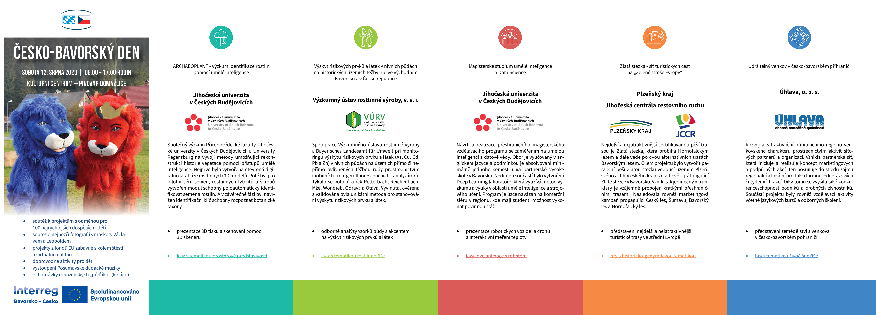 Soutěže o atraktivní ceny, kolo štěstí, virtuální realita, hudební vystoupení i ochutnávka tradičních koláčů. To vše a mnohem víc čeká na děti i dospělé 12. srpna v Domažlicích, kde Ministerstvo pro místní rozvoj pořádá výroční akci programu INTERREG Bavorsko – Česko 2021–2027. Celým dnem budou provázet oblíbení maskoti český lev Václav a bavorský lev Leopold.