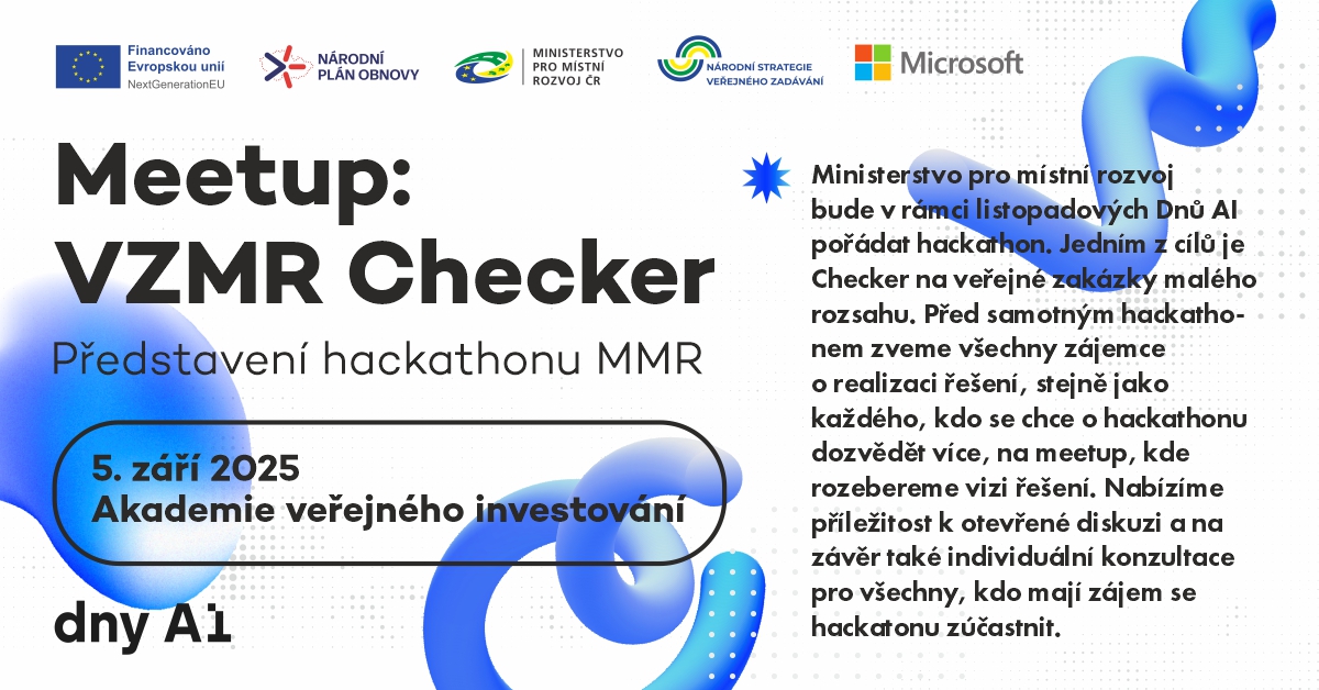 Ministerstvo pro místní rozvoj (MMR) pořádá v rámci listopadových Dnů AI unikátní akci nazvanou hackathon. Jedním z hlavních cílů je vytvoření nástroje Checker pro veřejné zakázky malého rozsahu (VZMR). Ten bude umět zkontrolovat obsah zadávacích podmínek VZMR, a pomůže tak zadavatelům předcházet chybám, sankcím i zbytečným korekcím. Před samotným hackathonem se 5. září 2025 uskuteční setkání v Akademii veřejného investování MMR. Proběhne otevřená diskuze i individuální konzultace pro všechny, kteří mají zájem se hackathonu účastnit.