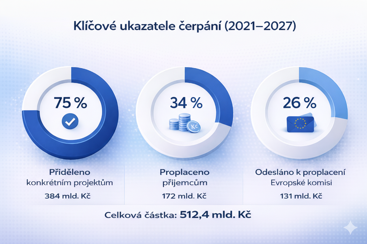 Data o čerpání potvrzují vysoké tempo. Příjemci dotací, tedy obce, firmy nebo neziskové organizace, mají na účtech proplacenu již více než třetinu celkové sumy (33,6 %). Celá čtvrtina všech prostředků (25,6 %) už navíc prošla kompletní administrativní kontrolou a byla odeslána Evropské komisi k finálnímu proplacení do státního rozpočtu. To dokládá, že projekty jsou nejen schválené, ale i úspěšně realizované a bezchybně vyúčtované.