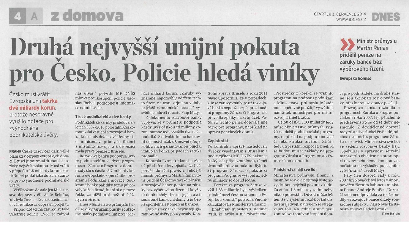 Důrazně odmítám zlehčené tvrzení v článku deníku DNES z 3. července „Druhá nejvyšší unijní pokuta pro Česko. Policie hledá viníky“, že by v případě nesprávně využité dotace pro zvýhodněné podnikatelské úvěry nešlo o nic vážného.