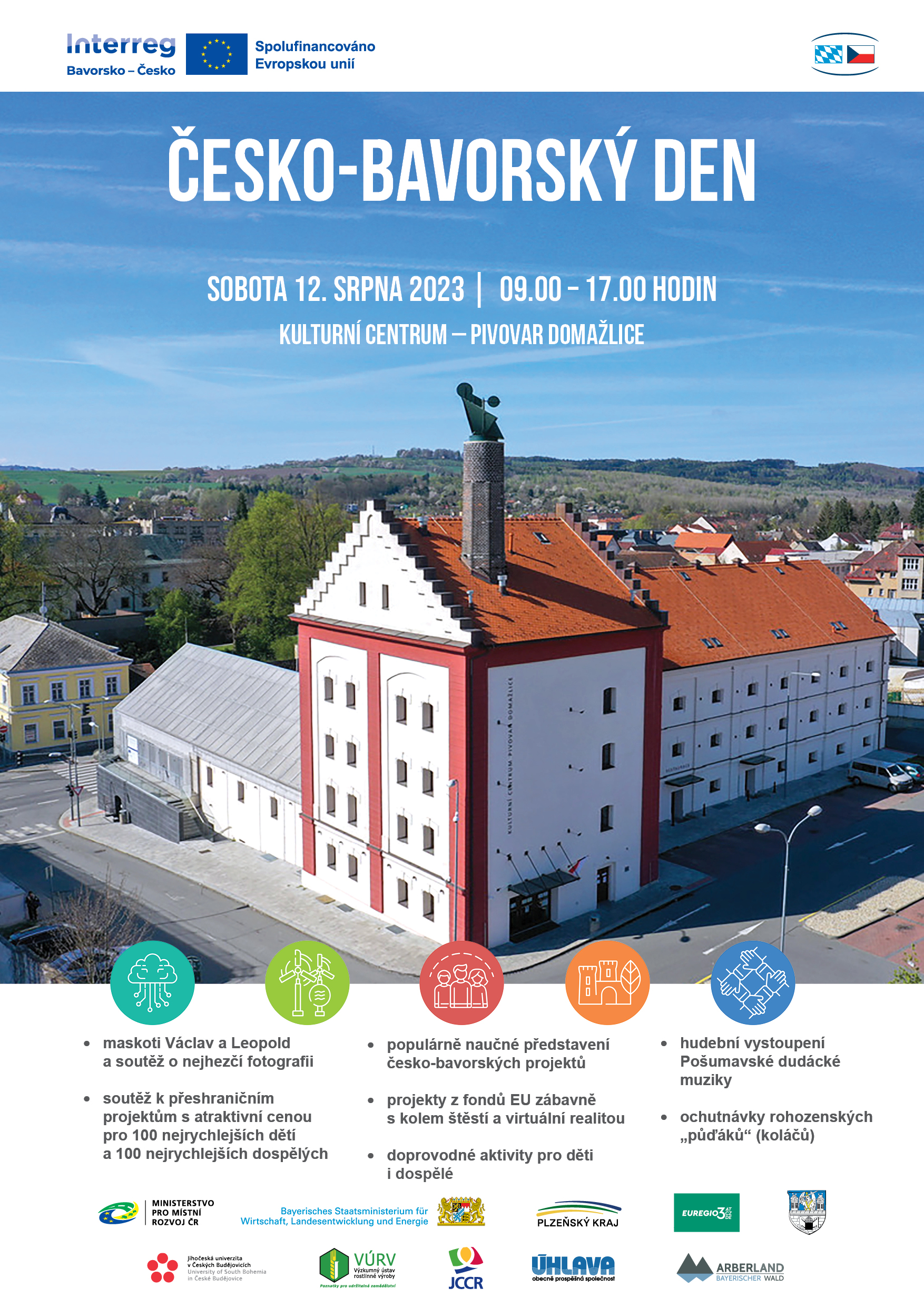 Soutěže o atraktivní ceny, kolo štěstí, virtuální realita, hudební vystoupení i ochutnávka tradičních koláčů. To vše a mnohem víc čeká na děti i dospělé 12. srpna v Domažlicích, kde Ministerstvo pro místní rozvoj pořádá výroční akci programu INTERREG Bavorsko – Česko 2021–2027. Celým dnem budou provázet oblíbení maskoti český lev Václav a bavorský lev Leopold.