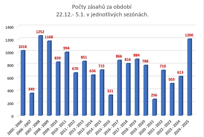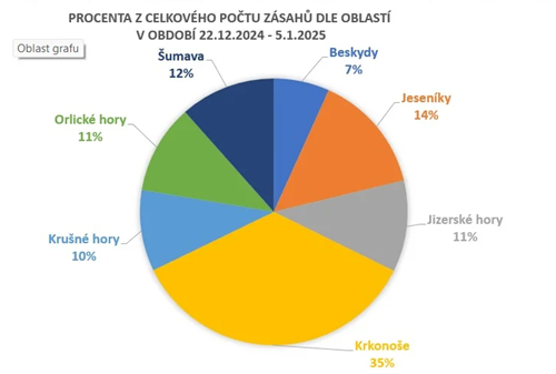 Letošní období vánočních prázdnin od 22.12.2024 – 5.1.2025 znamenalo pro horské záchranáře vyrovnání počtu zásahů s rekordními roky 2007 a 2009. Cca 1200 výjezdů patří mezi nejvyšší za toto období za posledních 20 let a odráží především zvýšený zájem turistů o české hory a také příznivé podmínky pro zimní sporty.